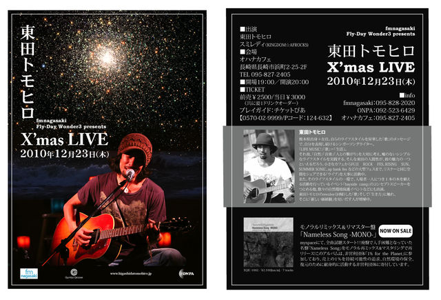 長崎でのLIVE情報です。 □FM nagasaki −Fly-Day Wonder3 presents 東田トモヒロX’mas LIVE □開催日:2010年12月23日(木) □出演:東田トモヒロスミレディ(KINGDOM☆AFROCKS) □会場 オハナカフェ 長崎県長崎市浜町2-25 2F 095-827-2405 □開場/開演: 開場 19:00/20:00 □TICKET:前売¥2500/当日¥3000(共に要1ドリンクオーダー) プレイガイド:チケットぴあ:【0570-02-9999/Pコード:124−632】 □info:FM nagasaki:095-828-2020 ONPA:092−523-6429