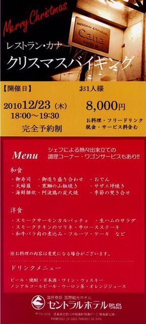 12/23日 吉野川市鴨島町 セントラルホテル鴨島 レストラン カナでliveをします。 http://www.central-kamojima.jp/restaurant/index.php 限定30名の、ゆったりとした、厳選素材のバイキング形式クリスマスイベントです。 現在、定員30に対して18名ほど確定しています。 30で締め切りだそうです。 聴き易いjazz、J-POPをjazzyにアレンジした曲などを18時から演奏いたします。 http://mikarin-trio.com ご存知の方も多いでしょうが、雰囲気の良い、味も美味しいレストランです。 12/23
