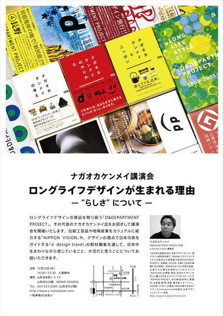 D&DEPARTMENT PROJECT YAMAGATA準備室の活動として、報告が できなくなってしまっていたのですが、この度ナガオカケンメイさんが 山形まなび館・MONO SCHOOLに来て講演会を開催することが決定しました! 伝統産業や地場産業をカジュアルに紹介する「NIPPON VISION」や デザインの視点で日本の旅をガイドする「d design travel」の取材編集 を通して、日本中をまわりながら感じていること、大切だと思うことに ついてお話いただきます。 ※D&DEPARTMENT PROJECTについて http://www.d-department.com/jp/ ※ナガオカケンメイさんにつ