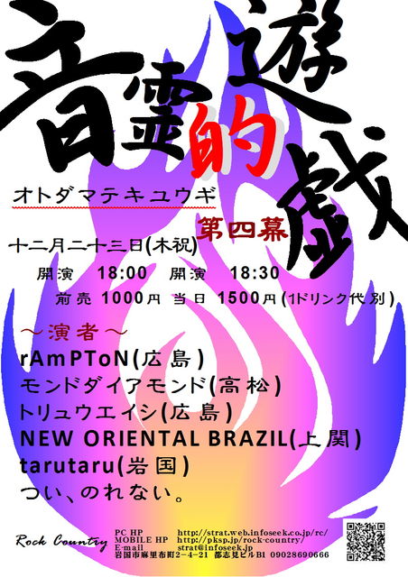 音霊的遊戯(オトダマテキユウギ) 第四幕 act ☆rAmPToN(広島) ☆モンドダイアモンド(高松) ☆トリュウエイシ(広島) ☆tarutaru(岩国) ☆NEW ORIENTAL BRAZIL(上関) ☆つい、のれない。 and more... adv 1000円 day 1500円(要1drオーダー)