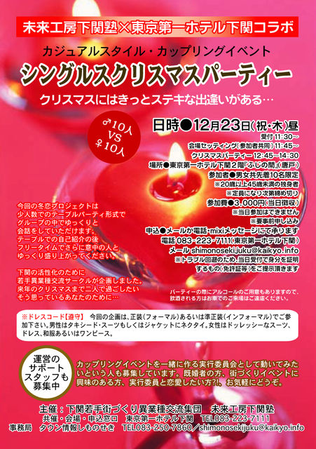 60対60の『秋恋プロジェクト』や10対10での『天空の冬恋プロジェクト』などのカップリングパーティーを開催してきた下関の異業種交流集団『未来工房下関塾』が、久しぶりの『婚活イベント』を開催します。 今回は『冬恋シングルス・クリスマスパーティー』で、会場として『東京第一ホテル下関』さんが全面協力していただけることになりました。 日時 12月23日(祝・木) 11:45〜14:30 場所 東京第一ホテル下関 2階『藤の間』 会費 男女共に3000円(軽食・アルコール有り)当日徴収 人数 10対10 先着限定 備考 ドレス