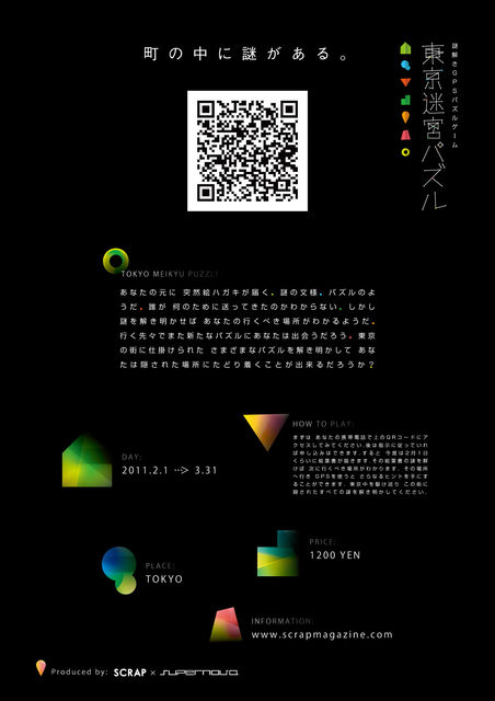 とのです。 ゲーム告知します。 その名も、東京迷宮パズル。 前回、スタジアムから脱出した人も、脱出できなかったリベンジの人も、是非! エンディングで、驚きの展開が(あるかもしれない?!) まずは、携帯で登録して、ハガキを待て! ※上の写真をクリックして、携帯でQRコード読み込んでね! ■■■■東京迷宮パズル■■■■ 内容:あなたの元に、突然絵ハガキが届く。謎の文様。パズルのようだ。誰が何のために送ってきたのかはわからない。しかし、謎を解き明かせば、あなたの行くべき場所が