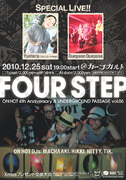 告知失礼いたします! 今年一年お世話になりました☆オンホットが贈る大忘年会は〜 ONHOTpresents... All Good Music & Vibes ONHOT 4th Anniversary & UNDERGROUND PASSAGE vol.06 題して… “ FOUR STEP ” @カーゴカルト 2010.12.25 sat 19:00〜2:00 □Ticket/2,000yen with 1drink □At door/2,000yen ■□■先着40名様にMIX CDをプレゼント■□■ All drink/500yen ※一部除外品があります ☆★SPECIAL LIVE★☆ Quepaso Quepaso(ケパソケパソ) http://quepasoquepaso.web.fc2.com/ 携帯専用 http:/