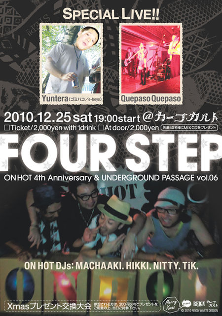 お陰様で4周年迎えることが出来ます。 ONHOTpresents... All Good Music & Vibes ◎ONHOT 4th Anniversary & UNDERGROUND PASSAGE vol.06◎ “ FOUR STEP ” @カーゴカルト 2010.12.25 sat 19:00〜2:00 □Ticket/2,000yen with 1drink □At door/2,000yen ■□■先着40名様にMIX CDをプレゼント■□■ All drink/500yen ※一部除外品があります ■SPECIAL LIVE■ Quepaso Quepaso Yuntera(ゴミハコ/e-boys) ♪ONHOT DJs: MACHAAKI. HIKKI. NITTY. TiK.♪ _/_/_/_/_/_/_/_/_/_/_/_/_/_/_/_/_/_/ 【Xmasプレゼ