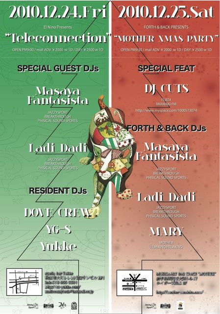 インフォメーションでお世話になります 2010.12.25 SAT『FORTH&BACK Dirty Xmas special』AT MOTHER MORIOKA FEAT DJ CUTS/IWAWAKI FM.FLAT4 http://www.myspace.com/1000513074 FORTH&BACK DJs MASAYA FANTASISTA&DSK Invisivle aka Ladi Ladi (JAZZYSPORT.BREAKTHROUGH.PHISICAL SOUND SPORTS) http://www.jazzysport.com Mary/Mother PM10:00START ADV 2000YEN/1D DAY 2500YEN/1D (前