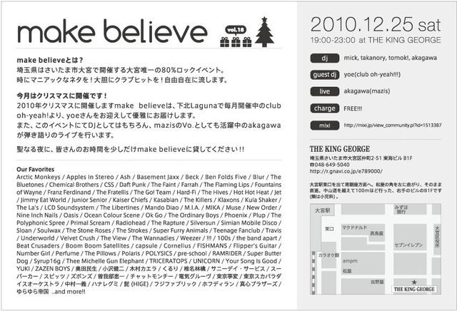 全国のmazisファンの皆様こんばんは!80%ROCK が流れるDJ イベントmake believeです。 半年ほど空いてしまいましたが、vol.18のお知らせです。 年内最後のmake believeは12/25(土)クリスマスに開催です。 今回は下北沢Lagunaで毎月第二土曜日に開催中の「Club Oh-Yeah!」よりyoeさんをゲストに迎え、更にレギュラーDJとしても参加しているakagawa (from Mazis)がアコースティックライブを披露します。 聖なる夜に皆さんのお時間を少しだけmake believeにお貸しください。 /// /// /// make believe vol.18 /// /// /// 2010.12.
