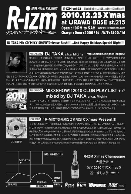 "R-IZM"vol/093 Blazin HipHop,R&B...and Good Music!!! DJ TAKA a.k.a.MIGHTY Mix CD"MIXX SHOW"Release Bush!!! ...and 2010 Last R-IZM Party!!! -Date- 2010.12.25.Sat -Venue- 浦和 Club Base St.215 -Open- 22:00-5:00 -Charge- Door:\2,000+1D W/F:\1,500+1D -Release DJ- DJ TAKA a.k.a.MIGHTY -Floor DJ- First Finger AKIYOSHI BROOKLYN TOMOKAZOO -Lounge DJ- ひり(R-IZMical) MMD-DROPKICK(R-IZMical) 4.G.E HAMACHI -G.M.P.MCs- FUKK TOMY MEKA -R-IZM Dancer-
