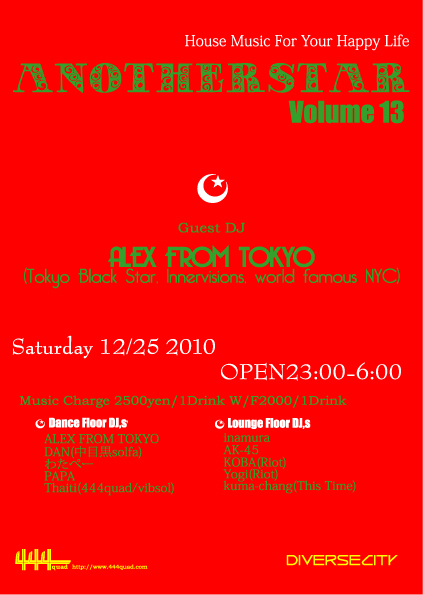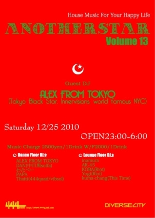 管理人様、告知失礼します。 今回のANOTHER STARは、X,mas スペシャルです! そしてゲストには、ここ数年、活動の拠点を日本からNYに移し、セレブ系からアングラPARTYまで、幅広い活動でその名を更に広めているALEX FROM TOKYOが初登場です。 その幅広いプレイ枠を持ち合わせてたアレックスならではの、素晴らしい音楽がクリスマスの夜に聴けるなんて、素晴らしいことです。 そして5FラウンジフロアDJ陣も、かなりスキルの高い面々勢ぞろいで、ムーディかつ、黒く野太い音楽が鳴り響いてくれることでしょう。 4Fメインフロアで踊り酔いしれ