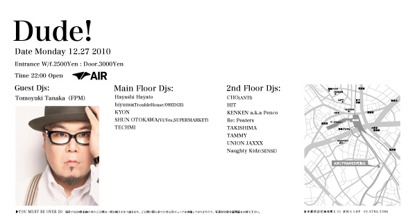 管理人様 告知失礼致します。 「洒落者、都会的な、ダチ・・・」。多彩な意味をもつワードをタイトルに掲げて10月にスタートしたパーティ“DUDE”が、2回目の開催を迎える。初回には、かつての「美容師ナイト」を彷彿させるようにビューティ&ファッション関連の人びとが多く詰めかけ、フロアはスタイリッシュな空気に包まれた。一方でDJ陣は硬派で良質な音をプレイし、空間に独特のヴァイブスを創出するのがこのパーティの特徴である。イヤーエンドの華やかな舞台となる今回は、それに相応しい ゲスト、Tomoyuki Tanaka(FPM)をフィーチュアす