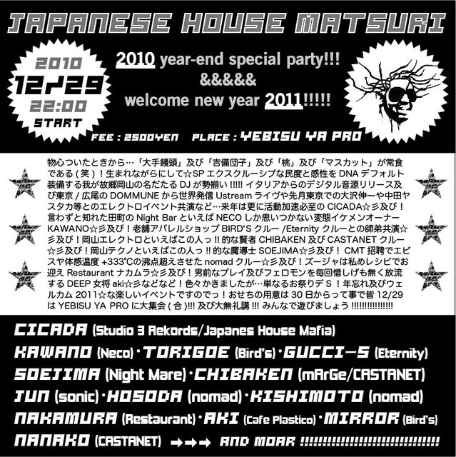 地 元のDJさんたち総動員でテクノやらハウスやらミニマルやらエレクトロやらプログレやらを総勢13人(予定)のDJさんが2010締めくくりIN DA HOUSE!!!!なお祭り騒ぎとなります☆彡☆彡☆彡岡山に住まう方々!及び中国〜四国地方の方々!といわず鳥取在住のあなた!島根在住のあなた!山口 在住のあなた!広島在住のあなた!香川在住のあなた!愛媛在住のあなた!徳島在住のあなた!高知在住のあなた!兵庫在住のあなた!大阪在住のあ