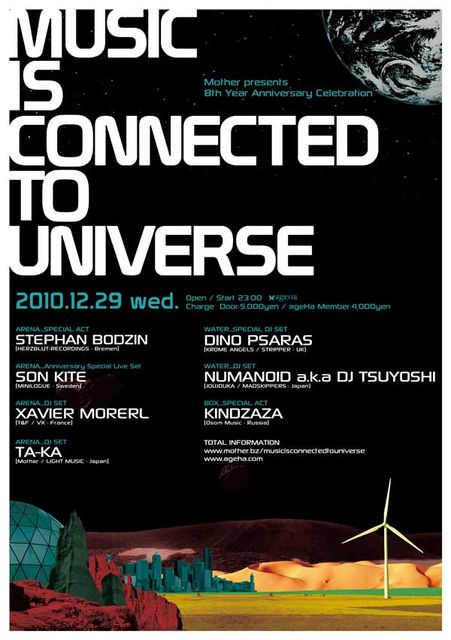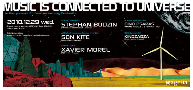 いよいよ2010年、ファイナル! カウントダウン気分の高まる年の瀬、12/29(水)に、 Mother 8周年アニバーサリーとなる スペシャルパーティーを「ageHa」にて開催します。 SON KITE、STEPHAN BODZIN、ZAVIER MOREL、TA-KAなど豪華出演陣が集結します。 記念すべき8周年を一緒に祝いましょう♪ 皆さまのお越しを心よりお待ちしております。 Mother 8th Year Anniversary Celebration Party 「MUSIC IS CONNECTED TO UNIVERSE」 @ ageHa 2010.12.29 (水) OPEN/START:23:00〜 【ARENA】 -- SPECIAL ACT -- STEPHA