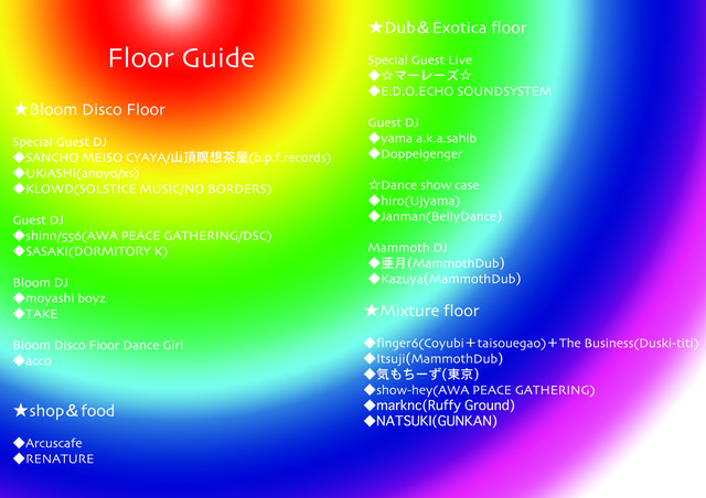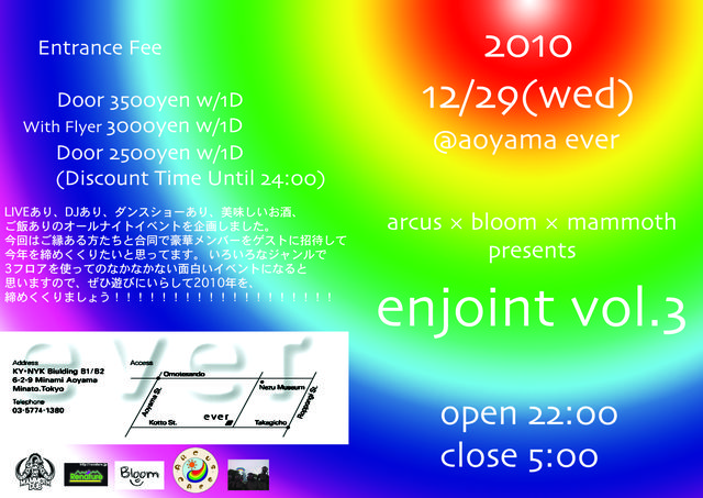 告知失礼します。 ーーーお知らせーーー 今年ラストの Bloom になります。 今年も足を運んで盛り上げて下さった方々本当にありがとうございました◎ 今年は青山のOATHを中心にやって参りましたが次は青山のeverでございます! 2010年ラストにもういっぱつかまします! Liveあり、ダンスショーあり、美味しいお酒、ご飯ありのオールナイトパーティーを企画しました。今回はご縁ある方たちと合同で豪華メンバーをゲストに招待して今年を締めくくりたいと思います。いろいろなカラーで3フロアを使ってのすごく面白いパーティーになると