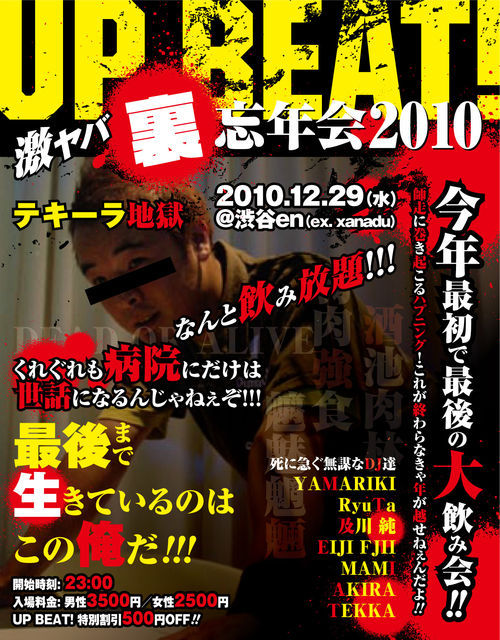 完全無敵の酔いどれパーティー! 音も熱いです! ハウス好きにおすすめです。 飲み放題なので気楽にお越し下さい! 2010.12.29(水) UP BEAT!-裏忘年会2010-@Club en(feat. XANADU) OPEN/23:00 DOOR/男性3500YEN/女性2500YEN (ドリンク飲み放題付き) DJ's: YAMARIKI RyuTa 及川 淳 EIJI FUJII MAMI AKIRA TEKKA 当日21時までに連絡いただければディスカウント(500円OFF)お取りします! お気楽にメッセージで連絡ください。