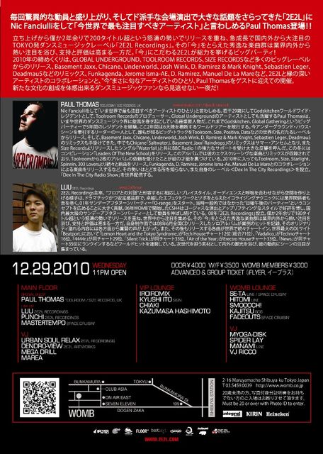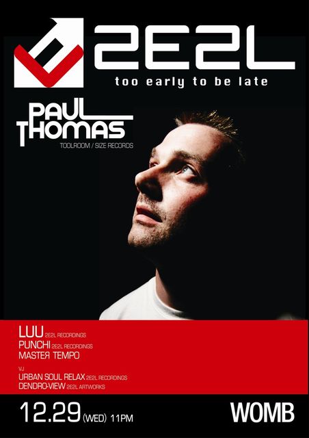 2E2L feat. PAUL THOMAS @ WOMB 12.29.2010 (WED) OPEN:23:00 DOOR¥4000 WITH FLYER¥3500 WOMB MEMBERS¥3000 <SPECIAL GUEST> PAUL THOMAS (TOOLROOM RECORDS/SIZE RECORDS, UK) <MAIN FLOOR> LUU (2E2L RECORDINGS) PUNCHI (2E2L RECORDINGS) MASTEЯTEMPO (SPACE CRUISIN') VJ: URBAN SOUL RELAX (2E2L RECORDINGS) DENDRO-VIEW (2E2L ARTWORKS) MEGA DRILL MAREA <VIP LOUNGE> DAIKI K. (2E2L RECORDINGS) IROIROMIX (2E2L RECORDINGS) KYUSHI ITO CHIAKI KAZUMASA HASHIMOTO <