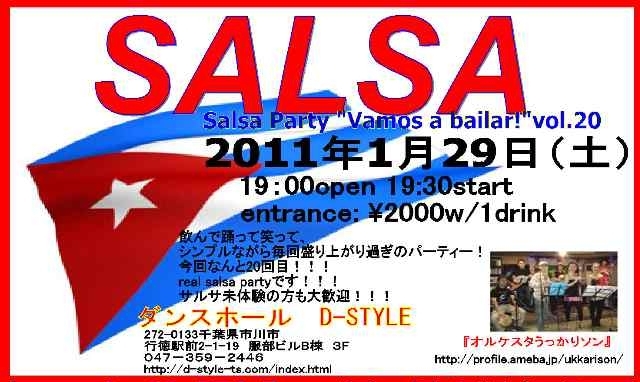 盛り上がります!!! 美味しいお食事!! 美味しいお酒!! 歌!! 演奏!! ダンス!!!! そしてアモール!!! サルサの全部が楽しめるイベント2連発のご案内です!!! ☆2010年12月20日(月) 『Salsa Dance Lesson&Party@ ESPETO BRASIL 』 18:30 OPEN 19:00〜2時間の無料初心者ダンス レッスン 21:00〜Free Dance Time entrance 1,500yen BEER&FOODS 500yen〜 ご案内:『オルケスタ・うっかり・ソン』のエイミー&ヒロカワ ※平日のゆったりとしたサルサパーティー。 ゆったりとご飲食をお楽しみいただきながら、 『Salsa
