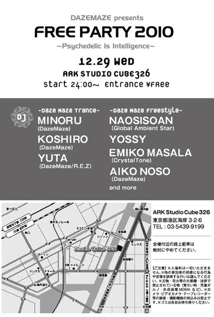 管理人さん、及びコミュの皆さん失礼いたします。 今は亡きTIP RECORDS!その世界観をリスペクトしながら、サイケデリックに、シャーマニックに進化し続ける!それがDazeMazeのパーティースタイル! そんなパーティー集団DazeMazeが行う今年のフリーパーティーの告知です。 社会の常識 ↓ 人類の知恵 ↓ 宇宙の流れ 考えるのではなく感じるのだ 心をリセットにすることで宇宙(そら)から知恵が降りてくる サイケデリックとゆう最強の知恵を手に入れよう 全知全能の宇宙の流れを DAZEMAZE Presents Free Party 2010