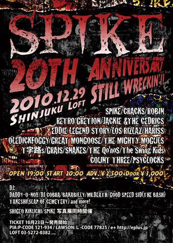 告知失礼します! 12/29 新宿LOFT、SPIKE結成20周年記念イベント「STILL WRECKIN’!!」の出演バンドが出揃いました。総勢18バンド&超強力DJ陣でお待ちしております。 SPIKE 20TH ANNIVERSARY 「STILL WRECKIN’!!」 BAND ・SPIKE ・CRACKS ・ROBIN ・RETRO GRETION ・JACKIE & THE CEDRICS ・EDDIE LEGEND STORY ・LOS RIZLAZ ・HARISS ・OLEDICKFOGGY ・GREAT MONGOOSE ・THE MIGHTY MOGULS ・T字路S ・GRAIS ・SNAKES ・THE QO’NOS ・THE SWING KIDS ・COUNT THREE ・PSYCLOCKS DJ ・DADDY-O-NOV