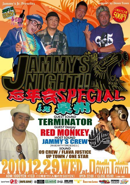 ★☆JAMMY`S NIGHT 忘年会SPECIAL in泉州★☆ ■HOST SOUND■ JAMMY`S CREW ■GUEST SOUND■ TERMINATOR ■GUEST DJ■ RED MONKEY ■SOUND■ 09 CREW FLAVA JUSTICE UP TOWN ONE STAR ●12月29日(水曜日) ●10時〜5時 ●@DOWN TOWN ●1000円+1CD (12時までに入場の方500円) ★振る舞いテキーラあり ★MIX CDプレゼント 29日はDOWNTOWNで忘年会ですよー♪