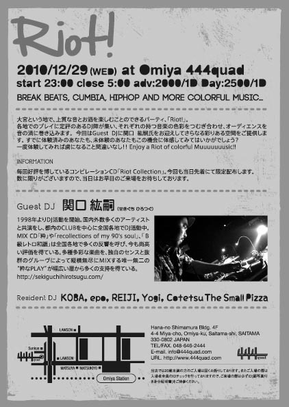 告知失礼いたします。 大宮444quadにて不定期開催されているお祭りパーティー、「Riot!」が再び開催です! 今回のGuest DJは、、、 「粋」なPLAYで知られる関口 紘嗣氏!!! もちろん、Resident DJ陣も負けずに「粋」に攻めます! 2010年締めくくり!はRiot@444quadで!!! ■Riot! 2010/12/29(WED) @大宮444quad start 23:00 close 5:00 adv \2000/1D Day \2500/1D Break Beats, Cumbia, HipHop and more colorful music... 大宮という地で、上質な音とお酒を楽しむことのできるパーティ、「Riot!」。 各地でのプレイに定評