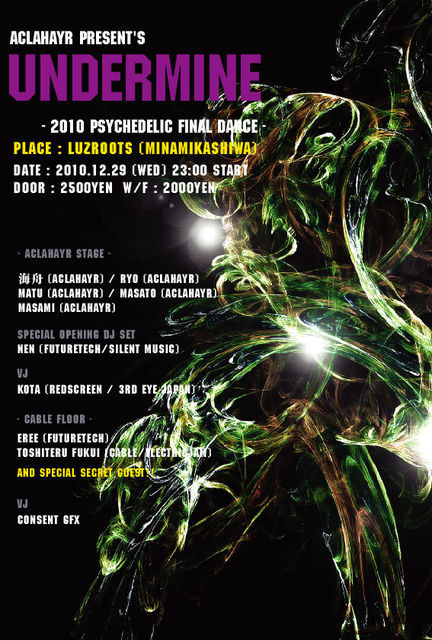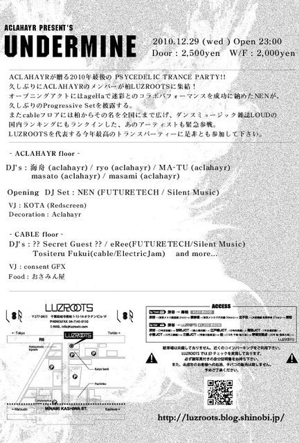 2010.12.29(wen) ACLAHAYR Presents UNDER MINE @南柏LUZUROOTS(ex.waRter) ACLAHAYRが贈る2010年最後のPSYCEDELIC TRANCE PARTY!! 久しぶりにACLAHAYRのメンバーが柏LUZROOTSに集結!! オープニングアクトにはagehaで迷彩とのコラボパフォーマンスを成功に納めたNENが、 久しぶりのProgressive Set を披露する。 またCableフロアには柏からその名を全国にまで広げ、ダンスミュージック雑誌LOUDの国内ランキングにもランクインした、あのアーティストも