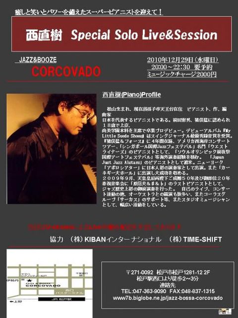 松戸 JAZZ&BOOZE CORCOVADO において12月29日20:00〜日本を代表するスーパーピアニスト西直樹さん を迎えてのライブがあります。 この模様は(株)KIBANインターナショナル、(株)TIME-SIFTの協力によりU-STREAMで配信されます。 LIVEに行けない方はPC,携帯でご覧になれます、 、http://www.ustream.tv/channel/jazznight-jp