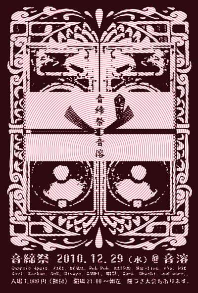管理人様告知失礼いたします。 今年一年、OLIVE OIL (OIL WORKS)、ALTZ (FLOWER OF LIFE/ALTZMUSICA)、DJ HIKARU (BLAST HEAD)、DNT a.k.a. DONUTS (FLOWER OF LIFE/POWWOW)、 B.I.G. JOE (MIC JACK PRODUCTION)、DJ YOGURT (UPSETS)などのゲストを迎えたスペシャル・パーティーから、他県で活躍する主のゲストを迎えたパーティー、そして多種多様なローカルパーティーとともに濃い一年を送ることができました。 そんな大小いろんなパーティーを年間通し支えてくれたDJ陣が集結し、2010年の締めを括る『音締祭』を開催。 今年最後の5次元ワールド