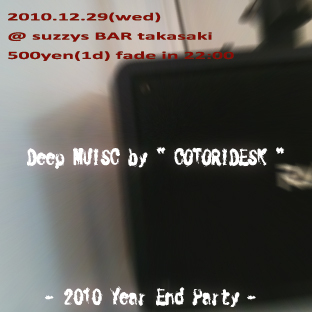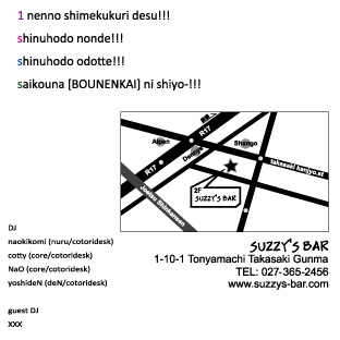管理人様 告知失礼します 来年も宜しくお願い致します 500yen +1D cotoridesk@高崎suzzysBAR 21:00 start timetable 21 naokikomi(nuru/cotoridesk) 22 yoshideN(deN/cotoridesk) 23 NaO(core/cotoridesk) 24 cotty(core/contact) 01 tko-japan(king-size) 02 ics(CARAVAN) 03 ゲスト 04 yagi(welcomehome/yagi's cafe) 1年の締めくくりです 来年もみんなで仲良く最高の年にするために死ぬほど飲んで踊りましょう! 出演アーティスト様 告知の協力お願い致します