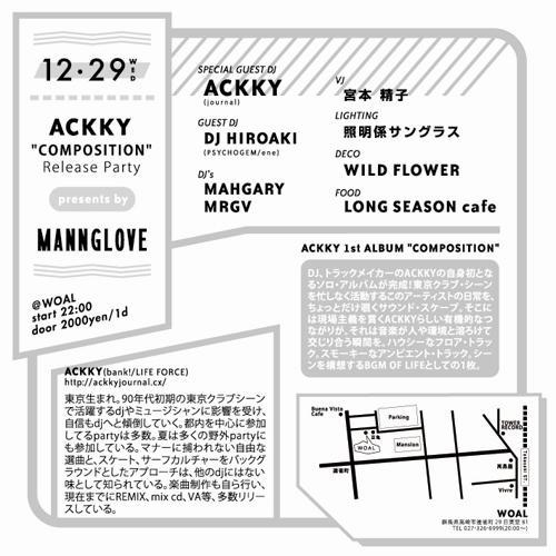 告知失礼します。 DJ、トラックメイカーのACKKY自身初となる ソロアルバム 'COMPOSITION' のリリースパーティーのお知らせです。 12/29(WED) ACKKY "COMPOSITION" Release Party~ presents by MANNGLOVE SPECIAL GUEST DJ:ACKKY(journal) GUEST DJ:DJ HIROAKI(PSYCHOGEM/ene) DJ:MAHGARY,MGRV LIGHTING:照明係サングラス VJ:宮本精子 SOUND:JOYFUL SOUND DECO:WILDFLOWER FOOD:LONG SEASON cafe OPEN 22:00~DOOR 2000yen/1D @WOAL ACKKY氏ならではのDEEP HOUSE〜TECHNOへの 独自のアプローチを是非現場で体感して下さい。 地元群馬からはDJ