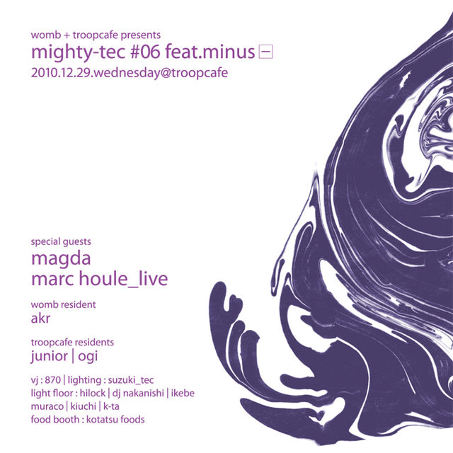 日本のクラブシーンを牽引し、時代を先導する東京のトップクラブWOMBと、関西のダンスミュージックシーンの担い手TROOPCAFEがジョイントするプロジェクトである「MIGHTY-TEC」の6回目の開催が決定した。 過去にMAGDA、MARC HOULE、REBOOT、PAUL RITCH、HEARTTHROB、HEIDIなど蒼々たるスーパースター達がゲスト出演しシーンの発展に大きく貢献してきた。第6回目となる今回もRICHIE HAWTIN主宰のレーベルMINUSとのコラボレートが実現し、RICHIE HAWTINが最も信頼する今やNo.1 女性アーティストと言っても過言でないMAGDAとMINUSの中心的トラックメー