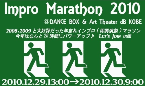 関西一円(大阪〜神戸〜姫路〜広島〜岡山〜九州)で、活動する関西インプロです。 今年で3年目のあのバケモノイベントがさらにパワーアップして神戸で開催されることになりました。 是非是非みんなで遊びましょ =========== Impro Marathon 2010 2008、2009と大好評だった、年忘れインプロ(即興演劇)マラソン 今年は20時間にパワーアップ!!! あんなことやこんなこと 手を変え品を変え20時間インプロショーを めいっぱい堪能していただけるお得なイベントです。 ショーに参加して楽しむもよし♪