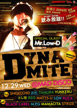 12月29日(WED) DYNAMITE@MAD DISCO OPEN/START 21:00 前売り 2500 当日 3000 ※21:00〜23:00迄 飲み放題! ※飲み放題の方は入場時別途500円頂きます! ※23:00以降(1D) ※前売り限定150枚! SPECIAL GUEST Mr.Low D DJ's SHIGECCHO(DYNAMITE) お杉(FINEST RECORDS) TAMURA(GAMECUBE) YUNKERU(GAMECUBE) とし坊 REO LON(11 DICE) RUCA(TASTY) MATTS-U(S.S KID) MC BLACK LABEL M.P.G(11 DICE)