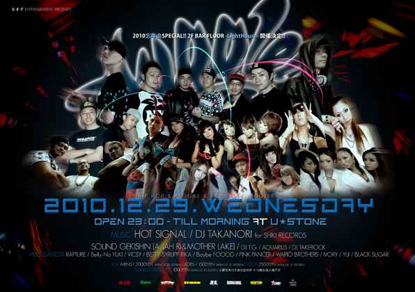 なまずENTERTAINMENT Presents 『JUGGLER』 〜Hip Hop & Reggae & R&B Party〜 -大忘年会Special- @U★STONE 2010.12.29(WED) [OPEN] 23:00-TILL MORNING [ADV] MENS \2000(Without1D/\500) LADIES \1500(Without1D/\500) [DOOR] \2500(Without1D/\500) [学生割引] \1000(Without1D/\500) ※要写真付き身分証持参 ※18歳未満入場不可 [MUSIC] HOT SIGNAL DJ TAKANORI for SHIKI RECORDS SOUND GEKISHIN DJ TAKEROCK DJ T.G [VIBES DANCER] RAPTURE Belly-Na YUKI VICSY BETTY-SYRUPP RIKA Baybe☆FOOOD PINK PANCER WARIO BROTHERS IVORY YUI