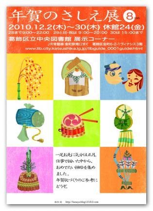 年賀のさしえ展 8回め 2010.12.2(木) 〜 30(木) 休館24(金) 28まで9:00〜22:00 29と日.祝は 9:00〜20:00 30は 15:00まで 葛飾区立中央図書館 展示コーナー JR常磐線 金町駅南口。葛飾区金町6-2-1ヴィナシス3階 http://www.lib.city.katsushika.lg.jp/libguide_0001guide.html 一足お先に気分は正月。 仕事で描いた中から、おめでたい挿絵を集め、さしえ個展を開いています 。 年賀状づくりのご参考にどうぞ。 二つの会場で同時期開催。 展示内容は異なります。 寅さんでは卯を題材にした葉書デザイン、図書館で