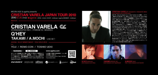 12/30のageHa WATERには、 JEFF MILLSを凌ぐとも言われる超絶テクニックで、25以上のアワードを受賞してきたスペインのNo.1 DJ、"Mr.TECHNO" CRISTIAN VARELAが登場!! 「MOON AGE × CLASH」や「CLASH」などの出演でARENAを盛り上げているQ'HEYとの共演をWATERにて身近に体験出来る! さらにTAKAMI、A.MOCHIのライブセットも見ものだ!! 「世界一エキサイティングな大晦日イヴ」でお会いしましょう! ■ Cristian Varela Exclusive Mix for ageHa http://soundcloud.com/ageha/cristian-varela-exclusive-mix-for-ageha ■ CRI