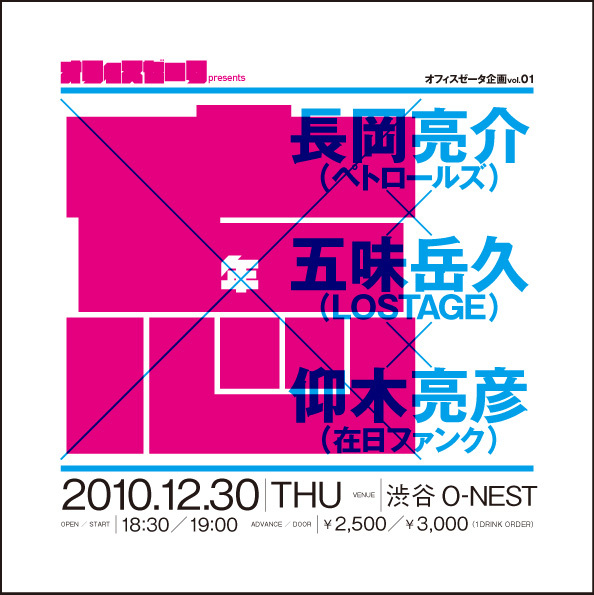 告知失礼いたします。 下記公演にLOSTAGE五味(岳久)さんに出演して頂きます。 貴重なソロ公演! よろしくお願いいたします! 2010年12月30日(木) オフィスゼータ企画 vol.1 出演 長岡亮介(ペトロールズ) 五味岳久(LOSTAGE) 仰木亮彦(在日ファンク) 会場 渋谷 O-NEST 開場 18:30 開演 19:00 前売 2500円 当日 3000円 (各ドリンク別) チケット ローソンチケット(79146) http://l-tike.com イープラス http://eplus.jp O-nest 03-3462-4420 問い合わせ http://www.office-zeta.jp