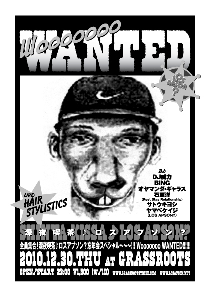 深夜喫茶♪ロスアプソン? 「全員集合!深夜喫茶♪ロスアプソン?忘年会スペシャル〜〜〜!!! Wooooooo WANTED!!!!!!」 時は、2010年師走・・・・・・・。都会の片田舎から変貌しつつある?東高円寺・グラスルーツにて「全員集合!深夜喫茶♪ロスアプソン?忘年会スペシャル〜〜〜!!! Wooooooo WANTED!!!!!!」です。まずは、今年の深夜喫茶♪ロスアプソン?を「古代すこやか」さでホッコリ色どってくれたDJ威力!師走期にも参加してもらっちゃって、なによりコヨリ!青春大阪18切符な風を運んで来てくれることでしょう!んで、BING!今年は全国をと
