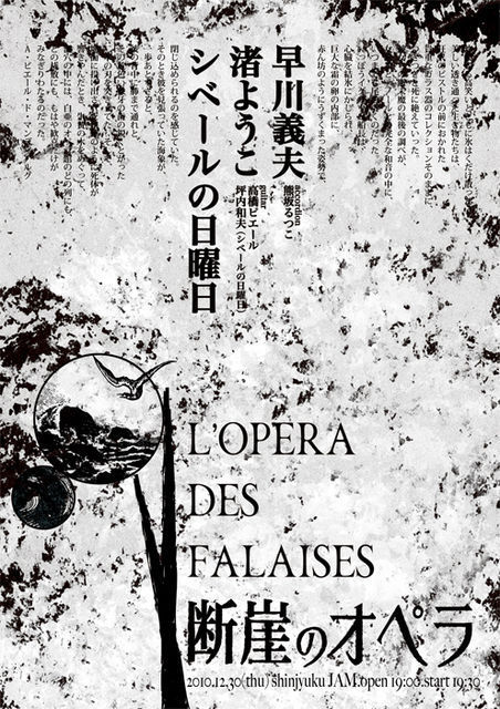 2010年12月30日(木)新宿JAM 『 断 崖 の オ ペ ラ 』 ■ 出演 早川義夫+佐久間正英 ・熊坂るつこ(ac)・トビウオリアキ(ヴィオラ) 渚ようこ+高橋ピエール(g)・坪内和夫(g) シベールの日曜日 ■ 開場・開演 開場 19時00分 開演 19時30分 ■ 料金 前売 3000円 当日 3500円 ※ドリンク代別 500円 ■ チケット発売中 ・新宿JAM店頭販売【15時〜24時】 ・ゴールデン街「汀」【20時以降】 ・ローソンチケット/Lコード74592 ・e+ ■ 予約/お問合せ ・JAM【15時〜24時】