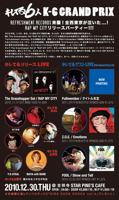 12月30日(木) キレてる6人の「K-6 GRND PRIX」 〜re:freshment records来襲!全西東京が泣いた...!RAP MY CITY リリースパーティ!〜 @吉祥寺STAR PINE'S CAFE http://www.mandala.gr.jp/spcnite.html START:24:00 door \2,000 w/f \1,500 ※先着順に超レアノベルティCD「KIRE ROCK SHOCK vol.4」プレゼント! ■キレてるゲストLIVE■ ・Fullmember(re:freshment records) ・Z.O.E.(re:freshment records,Z.O.E.一門) ・fool (Kamenoko production/re:freshment records) ■キレてるDJ■ ・関口紘嗣 ・佐藤康介 ・