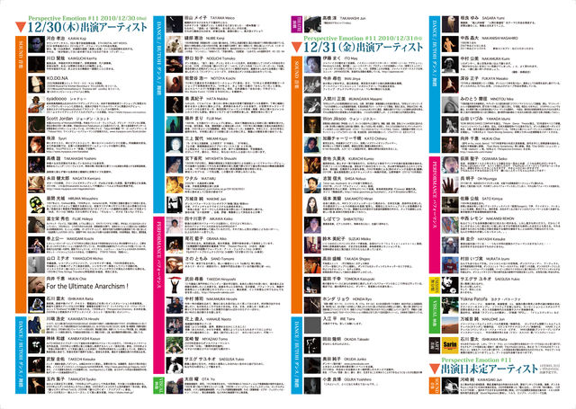 ■…………………………………………………………………………■ mixed media art festival PERSPECTIVE EMOTION #11 第11回・透視的情動 ■…………………………………………………………………………■ ★明日31日に出演します。shiga 日 時 12月30日thu、31日fri 1700 会 場:d-倉庫 (日暮里駅南口より7分) 荒川区東日暮里6-19-7-2F・03-5811-5399) 料 金 一日券\2,500/二日券\4,000/高校生以下\1,000 問 合 TEL: 090-9108-7491 (然々堂) e-mail: nen.nen.do☆gmail.com (然々堂) 30日