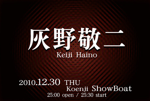 2010.12.30(FRI) 【 灰野敬二 keiji haino 】 毎年恒例、年末オールナイトワンマンライブを行います。 恒例となったイベントではありますが、常に、新しい音創りや表現方法を模索し、 灰野敬二は表現し続けています。 音の渦の中、ぜひご自分の目と耳で確かめて下さい。 at:東京 高円寺ShowBoat open 25:00/start 25:30 adv.¥2700/door.¥3200(+drink) ============================ 【 info 】 ShowBoat HP:http://www.showboat.co.jp/ tel:03-3337-5745 mail:ticket@s