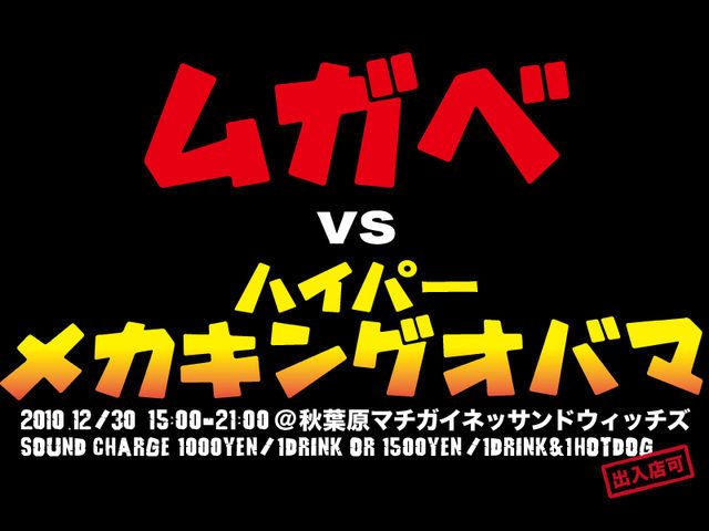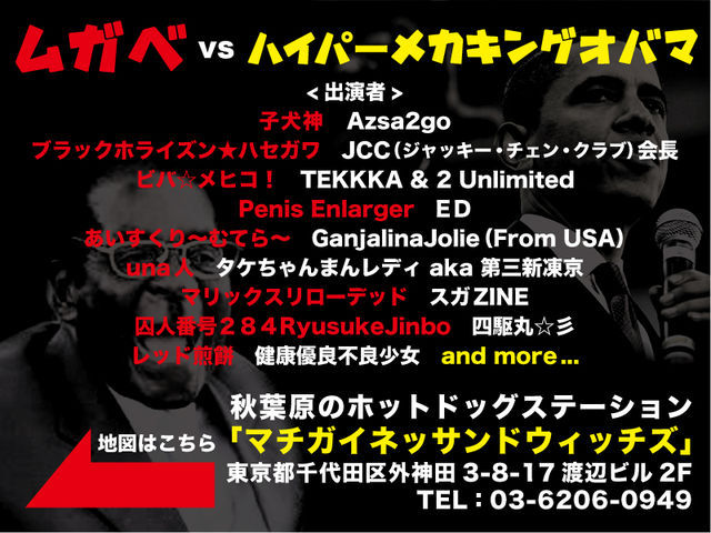 管理人様告知失礼します。 煽りからして意味不明なのでご説明させていただきます。 去年末にオバマVSメカオバマというイベントをやりました。要は忘年会です。 そして今回は会場を秋葉原マチガイネサンドウィッチズさんに移し、派手にやろうとおもっています。 貸切ではないので気になった皆さんは是非来店して一緒に楽しみましょう。 前回の衝撃が再び!今年もあいつが帰ってきた ムガベVSハイパーメカキングオバマ開催! ムガベ VS ハイパーメカキングオバマ 2010/12/30 15:00-21:00 @秋葉原マチガイネッサンドウィッチズ SOUND CH