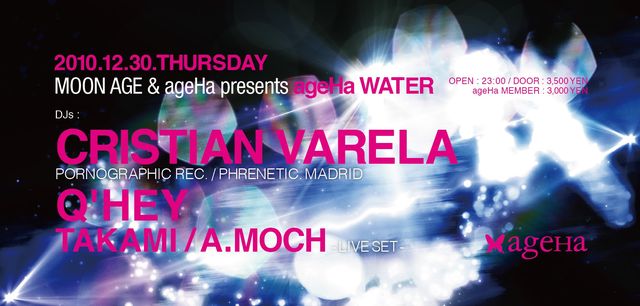 12/30のageHa WATERには、 JEFF MILLSを凌ぐとも言われる超絶テクニックで、25以上のアワードを受賞してきたスペインのNo.1 DJ、"Mr.TECHNO" CRISTIAN VARELAが登場!! 「MOON AGE × CLASH」や「CLASH」などの出演でARENAを盛り上げているQ'HEYとの共演をWATERにて身近に体験出来る! さらにTAKAMI、A.MOCHIのライブセットも見ものだ!! 「世界一エキサイティングな大晦日イヴ」でお会いしましょう! ■ Cristian Varela Exclusive Mix for ageHa http://soundcloud.com/ageha/cristian-varela-exclusive-mix-for-ageha ■ CRI