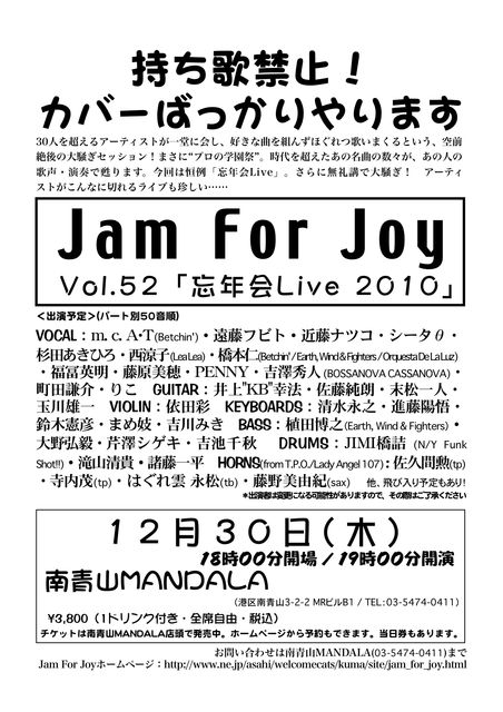 持ち歌禁止! カバーばっかりやります 30人を超えるアーティストが一堂に会し、好きな曲を組んずほぐれつ歌いまくるという、 空前絶後の大騒ぎセッション! まさに“プロの学園祭”。 時代を超えたあの名曲の数々が、あの人の歌声・演奏で甦ります。 今回は恒例「忘年会Live」。さらに無礼講で大騒ぎ! アーティストがこんなに切れるライブも珍しい…… Jam For Joy Vol.52 「忘年会2010」 ●日時:12月30日(木) 18時00分開場 / 19時00分開演 ●会場:南青山MANDALA (港区南青山3-2-2 MRビルB1 / TEL:03-5474-0411) h