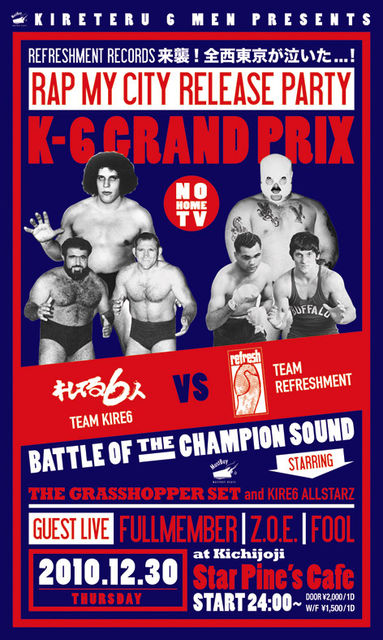 12月30日(木) キレてる6人の「K-6 GRND PRIX」 〜re:freshment records来襲!全西東京が泣いた...!RAP MY CITY リリースパーティ!〜 @吉祥寺STAR PINE'S CAFE http://www.mandala.gr.jp/spcnite.html START:24:00 door \2,000 w/f \1,500 ※先着順に超レアノベルティCD「KIRE ROCK SHOCK vol.4」プレゼント! ■キレてるゲストLIVE■ ・Fullmember(re:freshment records) ・Z.O.E.(re:freshment records,Z.O.E.一門) ・fool (Kamenoko production/re:freshment records) ■キレてるDJ■ ・関口紘嗣 ・佐藤康介 ・