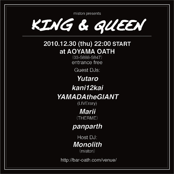 miston presents KING & QUEEN 1st Anniversary & 年忘れSpecial! 2010.12.30 (thu) 22:00 START at AOYAMA OATH(03-5888-5847) entrance free Guest DJs: Yutaro kani12kai YAMADAtheGIANT(LIVErary) Marii(THERME) panparth Host DJ: Monolith(miston) KING & QUEENは今回でいつのまにか一周年!!! 懐メロでもモノマネでもないearly 90's house flavaのパーティをお届けします。 early 90's限定でそのまま聴くのでは無く、今の耳で聴くearly 90'sな選曲でDJ達がヒネリを効かせる夜。ドレスアップ歓迎!こ