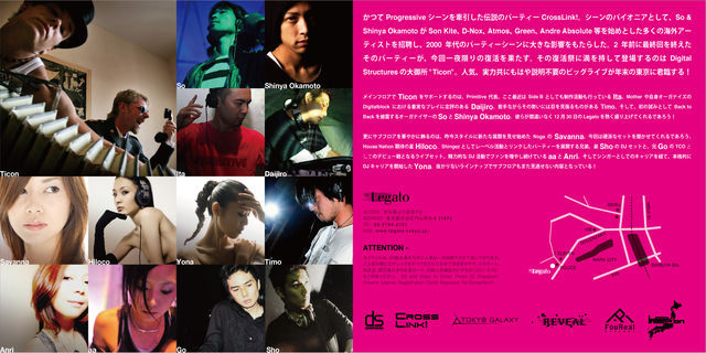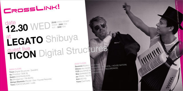 管理人様 告知失礼致します。 CrossLink! 2009.12/30 WED @Legato DOOR:¥3500 WF:¥3000 かつてProgressiveシーンを牽引した伝説のパーティーCrossLink!。シーンのパイオニアとして、So & Shinya OkamotoがSon Kite、D-Nox、Atmos、Greed、Andre Absolute等を始めとした多くの海外アーティストを招聘し、2000年代のパーティーシーンに大きな影響をもたらした。2年前に最終回を終えたそのパーティーが、今回一夜限りの復活を果たす。その復活祭に満を持して登場するのはDigital Structuresの大御所"Ticon"。人気、実力共にもは