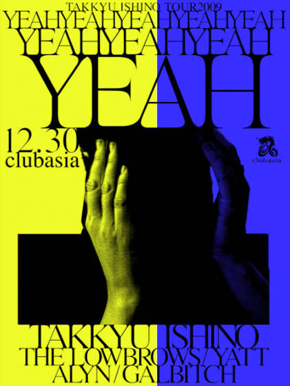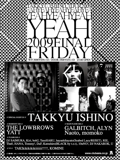 YEAH!YEAH!YEAH!YEAH!YEAH!!! 毎回様々なGUEST DJを召集し、 SUMMER SONIC'08のモジュラーステージにて、 何千人もの人々で溢れるフロアを魅了した THE LOWBROWS・YATT(LINDATUNE)がレジデントDJ を務める。 今年LASTのYEAH!!は TAKKYU ISHINO TOUR 2009をフィーチャーし、盛大に開催されます!!! YEAH!!!2009FINAL!!! - TAKKYU ISHINO TOUR 2009- WEDNESDAY 12/30 2009 at clubasia http://mixi.jp/view_community.pl?id=3501828 23:00 OPEN W/F.3000YEN / DOOR.3500YEN /// SPECIAL GUEST DJ ///