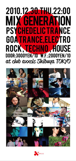 今年の3月以来、第2回目となる【MIX GENERATION】 DJ TSUYOSHIを筆頭にトランスシーンのパイオニアである大先輩たちと、 その活躍を見てシーンに入って行った僕らのような世代が一緒になって ひとつのパーティーを創り上げるという素敵な企画です! 3フロア開催なので色んな音と雰囲気を楽しめると思います。 日本人アーティストのみで構成され、 TEN-Gよりもっともっと若い世代も交えての今回のイベントは まさに MIX GENERATION! http://www.axxcis.net/sch1012/index.html#30 OPEN : 22:00 GENRE : Psychedelic Trance