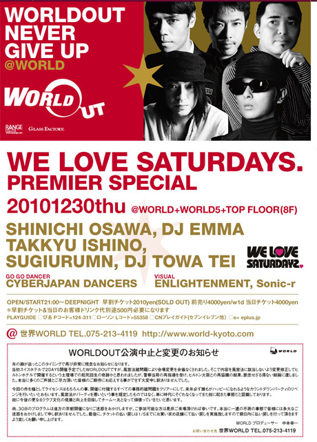 WORLDOUT ーNEVER GIVE UPー 開催日:2010年12月30日 開催会場:世界WORLD&WORLD5 -2店舗連動- http://www.world-kyoto.com/schedule/2010/12/30.html 『WE LOVE SATURDAYS. PREMIER SPECIAL』 出演者:テイ・トウワ/大沢伸一/DJ EMMA/石野卓球/SUGIURUMN GO GO DANCER:CYBERJAPAN DANCERS VISUAL:ENLIGHTENMENT/Sonic-r OPEN:22:00ーDEEPNIGHT イベントお問い合わせ先:世界WORLD 075-213-4119 再び京都へ、、WORLDOUT 民族大移動・・・ 「本当にすみません!」しか言えません。言いようがありません。。 最大の