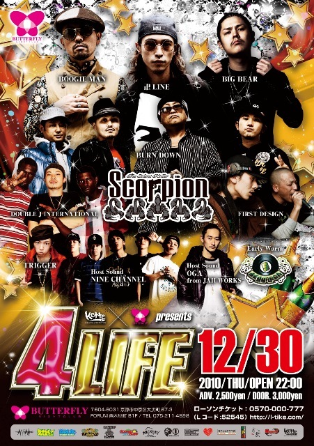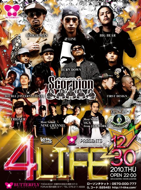 ■日程■ 2010年12月30日(木曜日) ■タイトル■ kette* & BUTTERFLY presents 『4 LIFE』 ■場所■ (京都•木屋町) BUTTERFLY (バタフライ) 〒604-8031 京都市中京区大黒町67-3 FORUM西木屋町 B1F TEL 075-211-4898 ■時間■ OPEN 22:00 〜CLOSE 05:00 ■料金■ 前売 2500円 当日 3000円 ※但し1ドリンク代(500円)別途頂きます。 ■ジャンル■ REGGAE ※オールナイトパーティー・クラブイベント ■出演者■ <GUEST> 卍LINE BOOGIE MAN BIG BEAR <GUEST SOUND> BURN DOWN SCORPION FIRST